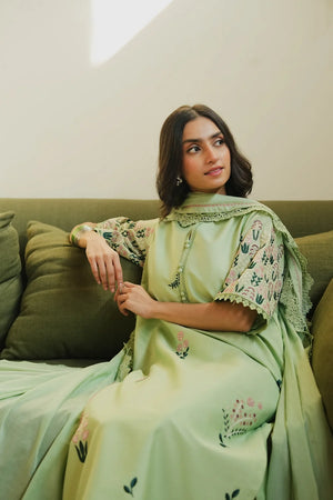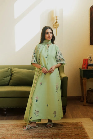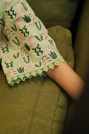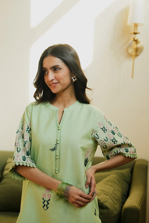Elegant pistachio ensemble with a long embroidered shirt and buttoned neckline. Paired with lace-finished straight trousers, it exudes sophistication, subtle luxury, and timeless festive vibes.